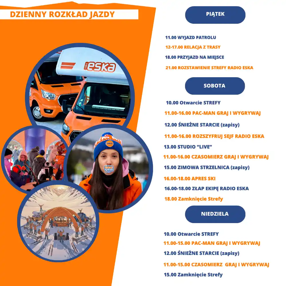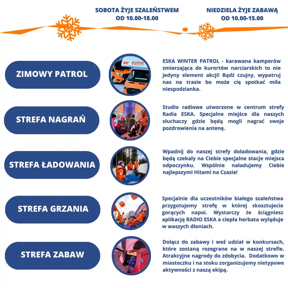 Przez dwa dni wypatrujcie również pomarańczowych kurtek na stokach gdzie ekipa będzie patrolować stoki i zachęcać do wizyty w strefie Radia Eska.